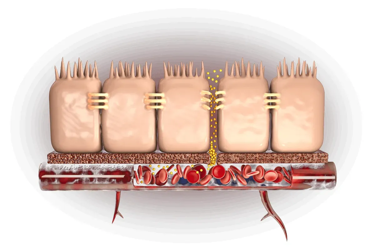En un intestino sano, las conexiones estrechas (tight junctions) entre las células forman una barrera firme. Solo pasan nutrientes digeridos correctamente, mientras se bloquean toxinas, bacterias dañinas y proteínas mal digeridas.